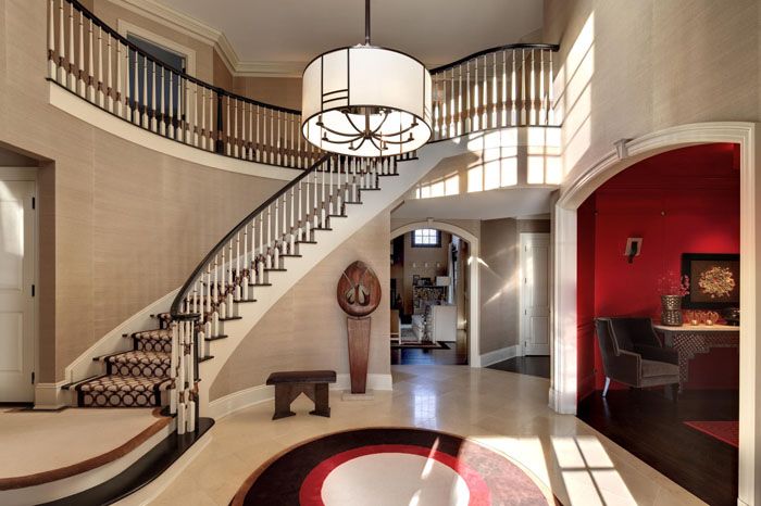 Предметите за декор се използват за запълване на свободното пространство: статуи, вази, стойки за чадъри и други елементи, за които говорихме по-горе. Големите лампи са подходящи в такава стая, таван, стена и под.