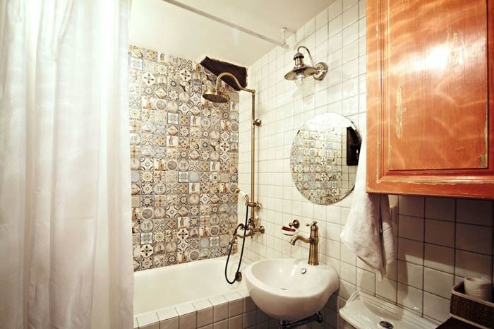 Декорацията на стените е много важна, при която керамичните плочки се използват рядко. Боя или тапет, понякога обикновена мозайка. Но основата са аксесоари. Например антични лампи, огледала, нощни шкафчета, антични кранове, медни тръби и фитинги комуникации. Разгледайте снимките по-долу и веднага ще разберете отличителните черти на ретро стила.