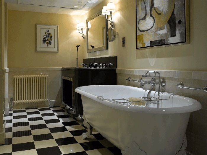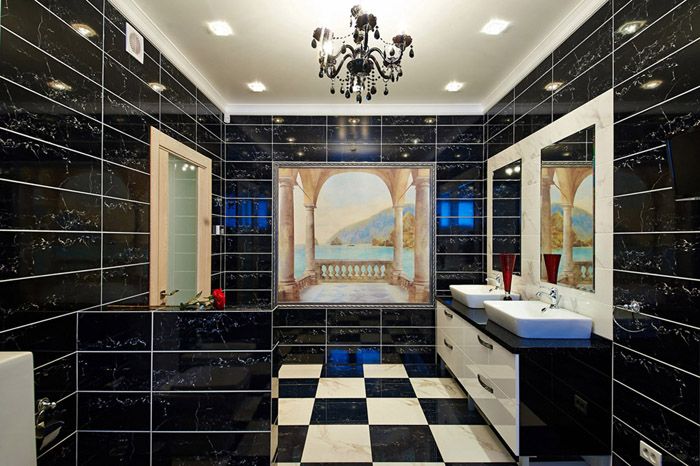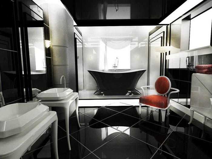 Дизайнерите дори добавят някои ретро елементи към този стил. Но цветовата схема на банята трябва да бъде в черно и бяло, разрешени са сиви петна. Ето защо основният материал за довършване на банята е керамичните керемиди на шахматно ниво. Разбира се, днес, в епохата на променящия се свят, други нюанси са започнали да се въвеждат в стила на арт деко, но те не трябва да се открояват твърде много.