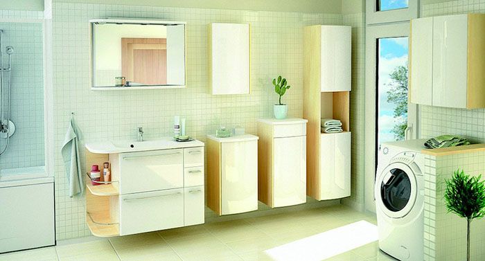 - Ако банята е малка стая, тогава не бива да я затрупвате. Ето защо е по-добре да инсталирате мивка с шкаф или плосък тип, под който пасва на пералня.