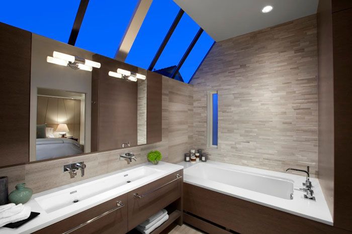 Вторият най-важен водопровод - мивка... Модерен дизайн на баня е инсталирането на две мивки. Разбира се, не във всички градски апартаменти може да се използва тази опция за подреждане, но в частни къщи, като се вземат предвид съвременните идеи за интериора на банята през 2019 г. (снимка по-долу), две купи не са само оригинален подход, това е увеличаване на функционалността на стаята. Между другото, разходите за закупуване и инсталиране на две мивки бързо се изплащат по отношение на удобството и функционалността. И ако в къщата живее достатъчно голямо семейство, тогава тази опция ще бъде добро решение на проблема със сутрешните водни процедури.