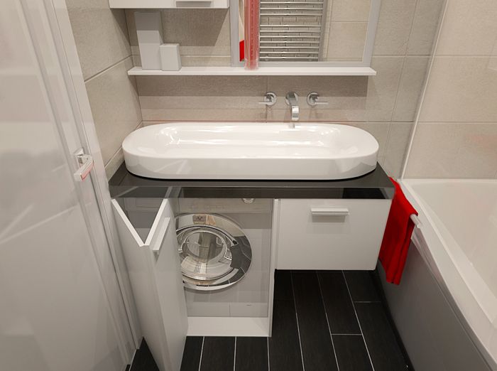 - Така че първата грешка е планирането. Обикновено в малките стаи ваната е инсталирана по протежение на една от стените. Ако тук е решено да се инсталира пералня, тогава е по-добре да се даде предимство на душ кабина, като се премахне ваната. Въпреки че има опция за монтаж перални под мивката, тогава няма да има място за шкаф, където можете да поставите кърпи и домакински водопроводни принадлежности. Тоест във всеки случай трябва да изберете.