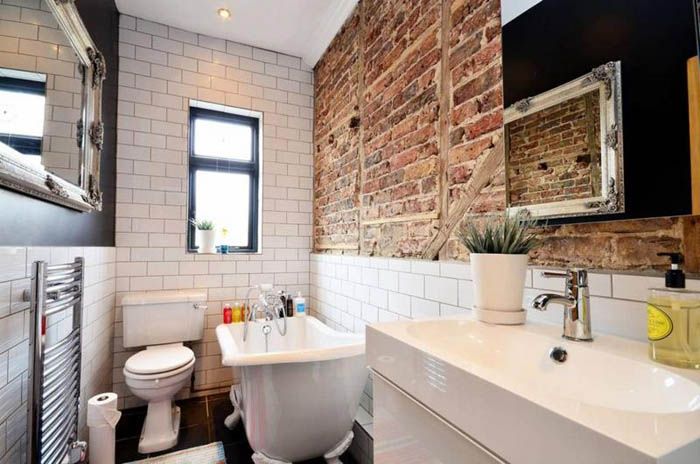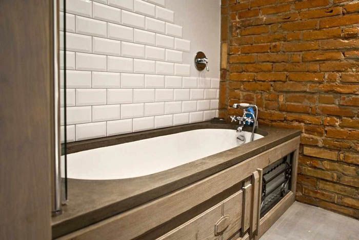 Но трябва да се добави, че те пуснаха пипалата си в този стил модерни довършителни материали... Тоест, тухлата като основа не винаги е на първо място. Те могат да украсят част от стената, подчертавайки стиловото запълване, но останалите повърхности са облицовани с керамични плочки, които трябва да бъдат със същия размер. тухли... По-долу на снимката е точно такъв дизайн на баня с облицовани стени.