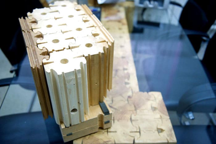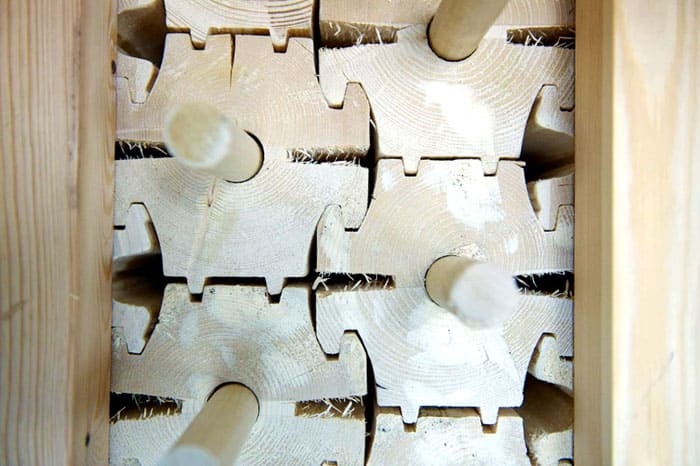 Едно парче дърво се притиска към друго, докато хребетите трябва да влизат в жлебовете. За да се предотврати разпадането на конструкцията, тя е допълнително подсилена с дюбели