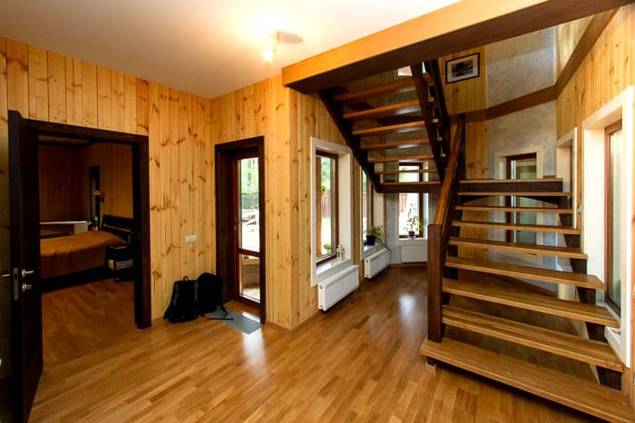 Голям плюс на дървените конструкции е доброто енергоспестяване. Стените са положени по такъв начин, че течението и вятърът да не проникват през тях. Дъските, поставени напречно, пропускат въздух в стаята и следователно губят много за къщи от вертикални греди. Топлопроводимостта се различава един и половина пъти.