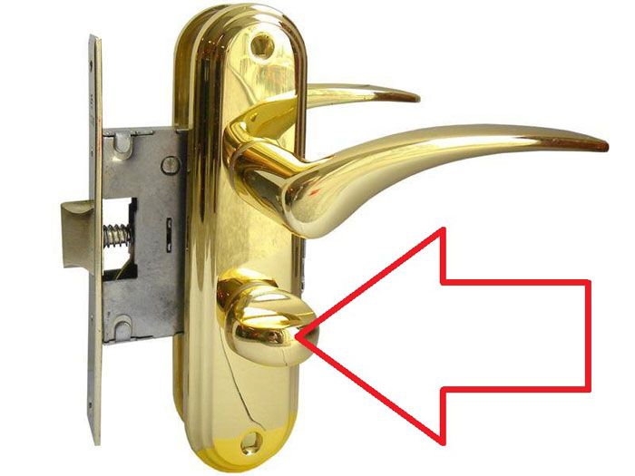 Стрелката маркира устройството за заключващо устройство. В подходящото положение предотвратява завъртането на основната дръжка на вратата на банята и тоалетната.