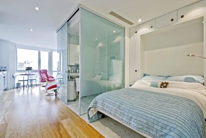 За да се спести място, е инсталирана конструкция с ниша вътре в стената. Крилото на вратата се движи там при отваряне
