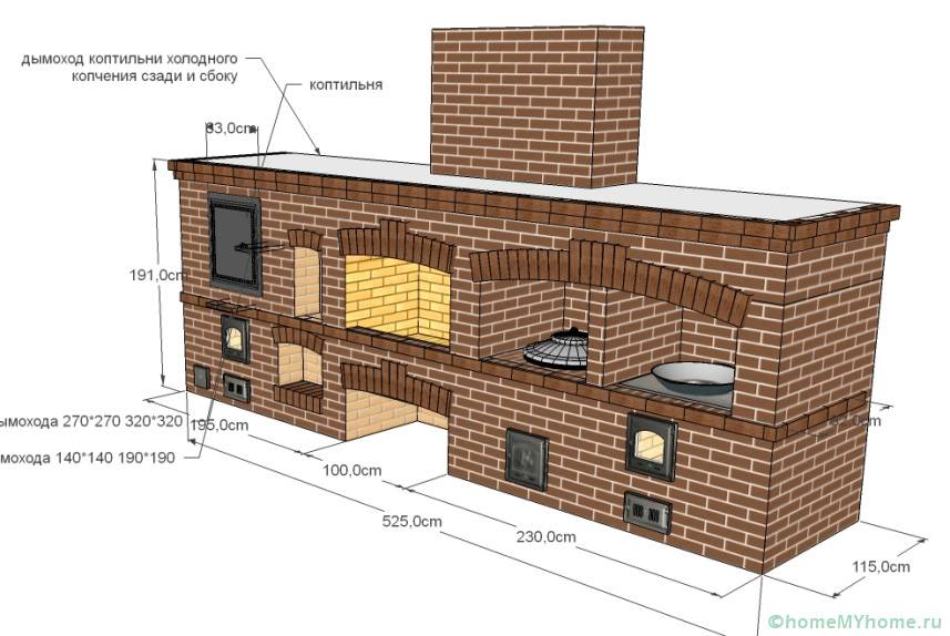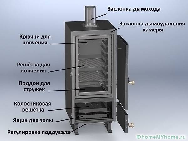 - използва се горивен резервоар с две камери. Под мангала е разположено огнище, а суровините са разположени върху метална основа за генериране на дим. Тягата се формира в горната камера.