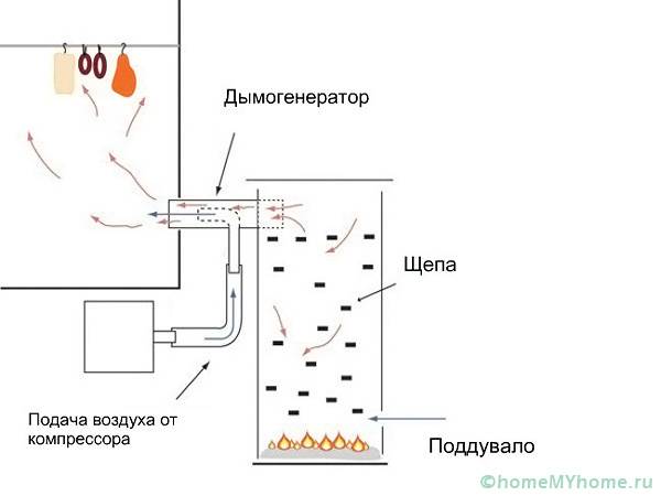 Димът се генерира в долната камера, наречена горивна камера. В този случай се използват няколко метода: