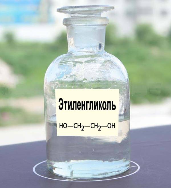 - Αντιψυκτικό αιθυλενογλυκόλης - παρασκευάζεται με βάση το ίδιο οινόπνευμα. Αναφέρεται στο πολυατομικό. Μετά τον καθαρισμό, είναι ένα διαυγές υγρό με ελαφριά λιπαρότητα. Δεν υπάρχει μυρωδιά, αλλά υπάρχει μια γλυκιά επίγευση. Μην δοκιμάσετε επειδή αυτή η ουσία είναι τοξική. Είναι επικίνδυνο να χρησιμοποιείται, ειδικά σε συστήματα διπλού κυκλώματος, όταν υπάρχει πιθανότητα να εισέλθει στην παροχή νερού. Επίσης, δεν συνιστάται η χρήση του σε συστήματα με ανοιχτό δοχείο διαστολής, καθώς μπορεί να δηλητηριαστεί από τους ατμούς του. Επιπλέον, τέτοια αντιψυκτικά δεν ανέχονται υπερθέρμανση. Κάθε συγκεκριμένο προϊόν έχει τη δική του θερμοκρασία υπερθέρμανσης, εάν το υγρό είναι υψηλότερο από αυτόν τον δείκτη, το "μη-κατάψυξη" θα πέσει σε ένα στερεό ίζημα και θα εναποτίθεται σε όλο το σύστημα, το οποίο θα οδηγήσει σε επιδείνωση της ανταλλαγής θερμότητας ή ακόμη και βλάβη.