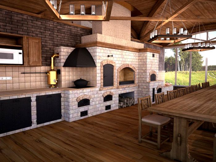 Είναι βολικό εάν το συγκρότημα μπάρμπεκιου βρίσκεται στη μία άκρη του κιόσκι, αφήνοντας ελεύθερο χώρο για εγκατάσταση τραπεζιού και πάγκων, ελεύθερη κίνηση κατά το μαγείρεμα
