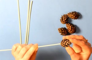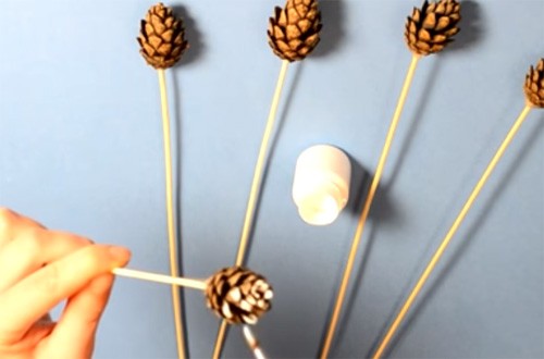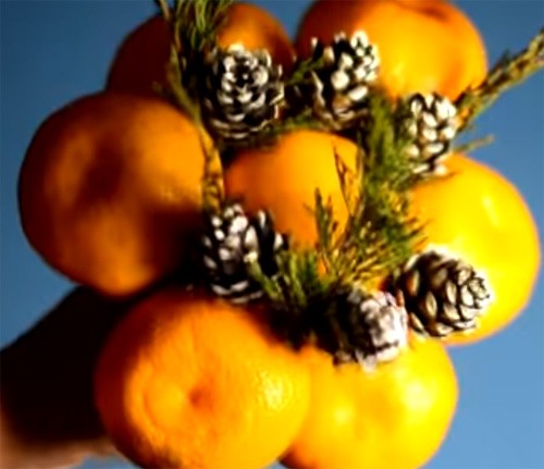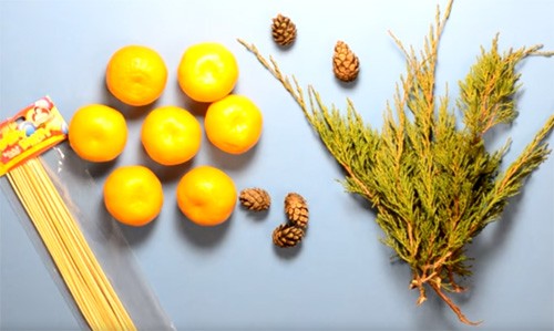 Για να δημιουργήσουμε ένα μπουκέτο μανταρίνια Πρωτοχρονιάς, θα επιλέξουμε τα απαραίτητα συστατικά: διάφορα μανταρίνια (5-7 κομμάτια), τον ίδιο αριθμό μεγάλων όμορφων κώνων, λευκό ακρυλικό χρώμα με πινέλο, θερμικό όπλο, χαρτί χειροτεχνίας, σπάγγο, σουβλάκια και κλαδάκια ερυθρελάτης, thuja ή αρκεύθου.