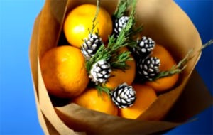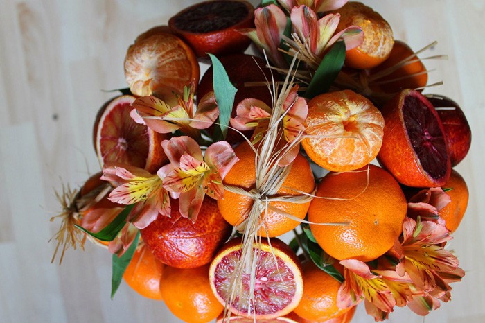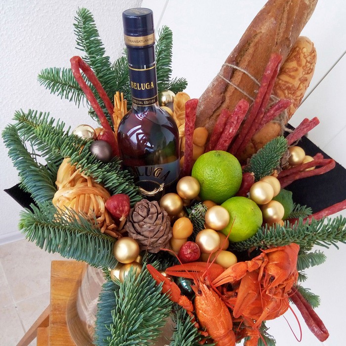 Τα χειμερινά μπουκέτα φρούτων είναι όμορφα και αρωματικά: παρουσιάζονται με πολύχρωμα μήλα, εσπεριδοειδή, αχλάδια, μπανάνες και σταφύλια. Τα βρώσιμα πολύχρωμα φρούτα φαίνονται αρμονικά στο φόντο των πράσινων βελόνων πεύκου.