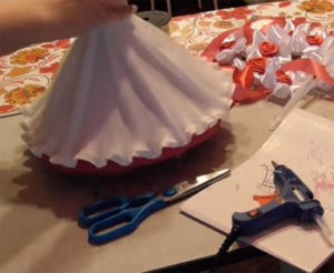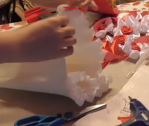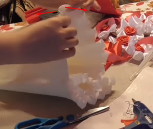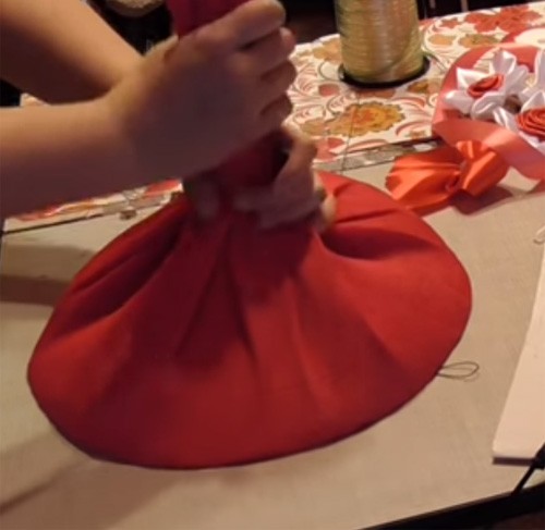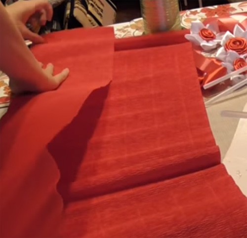 Αγοράζουμε δύο ρολά κυματοειδούς χαρτιού διαφορετικών χρωμάτων, προετοιμάζουμε ένα θερμικό όπλο, σατέν λουλούδια από ύφασμα ή κώνους με κλαδιά ερυθρελάτης, σπάγγο, μεσαίου μεγέθους σατέν κορδέλα, παιχνίδια, χαρτοπετσέτες, λεπτό σύρμα, ψαλίδι.