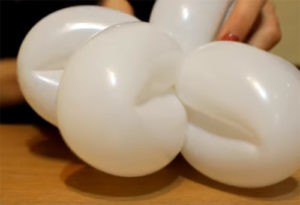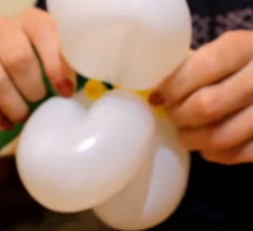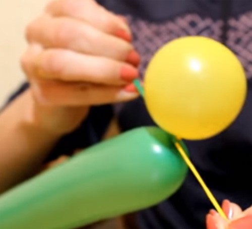 Αγοράζουμε μεγάλες μπάλες από ροζ, πράσινες, λευκές και μικρές στρογγυλές κίτρινες μπάλες. Χρειαζόμαστε επίσης ψαλίδι και αντλία μπαλονιού.