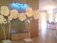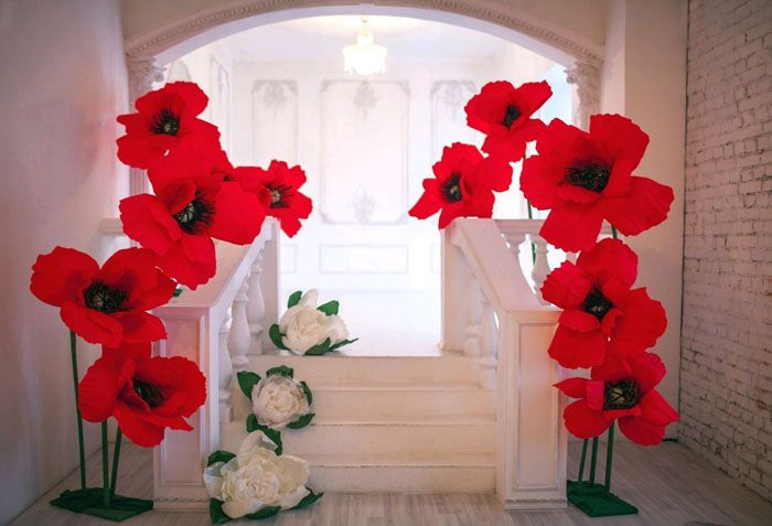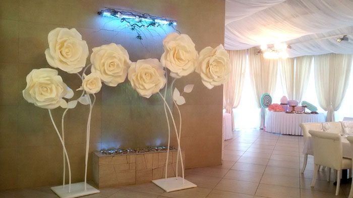 Τεράστια λουλούδια από το αφρώδες είναι μια εσωτερική διακόσμηση για ένα σπίτι ή ένα εμπορικό πάτωμα. Μια τέτοια ασυνήθιστη διακόσμηση θα προσελκύσει αμέσως την προσοχή των επισκεπτών. Για να δημιουργήσετε ένα τέτοιο λουλούδι, πρέπει να χρησιμοποιήσετε τα ίδια μοτίβα, μόνο σε μέγεθος. Για κοπή, είναι προτιμότερο να παίρνετε ρολό foamiran, δεν θα σας περιορίσει στις διαστάσεις των κενών.