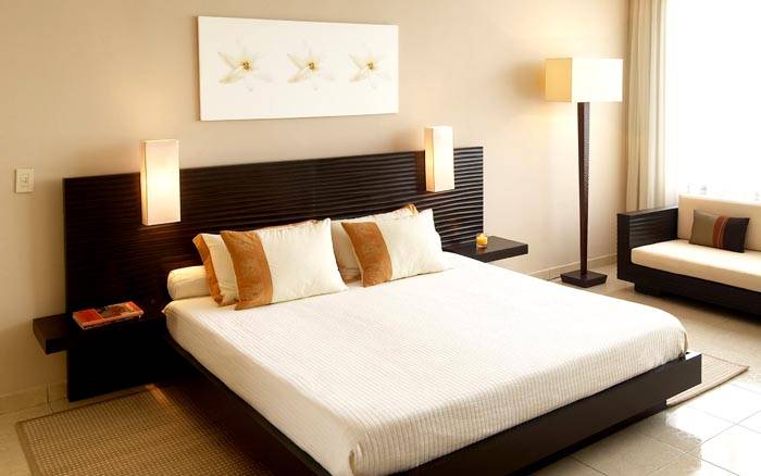 Το αρχικό εσωτερικό μπορεί να πραγματοποιηθεί ακόμα και με περιορισμένο προϋπολογισμό. Οι οροφές και οι τοίχοι μπορούν να επιχριστούν και μετά να βαφτούν με ματ λευκή βαφή για να δημιουργήσουν ένα σύγχρονο περιβάλλον. Για το δάπεδο, επιλέξτε ένα έλασμα με υφή ξύλου. Το ίδιο υλικό μπορεί να χρησιμοποιηθεί για να διακοσμήσει τον τοίχο πίσω από το κεφαλάρι. Για άνοιγμα παραθύρου, είναι κατάλληλες κουρτίνες απλής κοπής. Ο σωστός φωτισμός μπορεί να είναι μια πραγματική διακόσμηση του εσωτερικού. Εν πολυέλαιος μπορεί να συμπληρωθεί με ψηλούς λαμπτήρες δαπέδου και κομοδίνα.