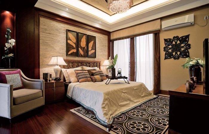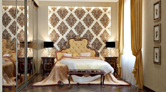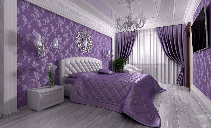Για την κρεβατοκάμαρα, είναι κατάλληλη η μη υφασμένη ταπετσαρία με floral στολίδια, διακοσμητικό γύψο, μεταξοτυπία και κεραμική βάση. Το εσωτερικό χρησιμοποιεί γκριζωμένες λιλά, μπεζ, χρυσές και σμαραγδένιες αποχρώσεις.