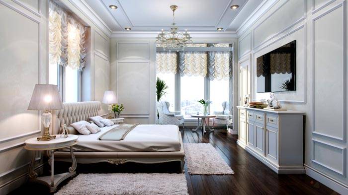 Ο σχεδιασμός του υπνοδωματίου σε κλασικό στιλ είναι πάντα σχετικός. Η φωτογραφία δείχνει τα κύρια σημεία αυτού του σχεδιασμού. Η κλασική έκδοση σε λευκό φαίνεται υπέροχη. Η χρωματική παλέτα μπορεί να επιλεγεί από άλλες καταπραϋντικές αποχρώσεις: άμμο, γαλακτώδες, μπεζ και ελιά.