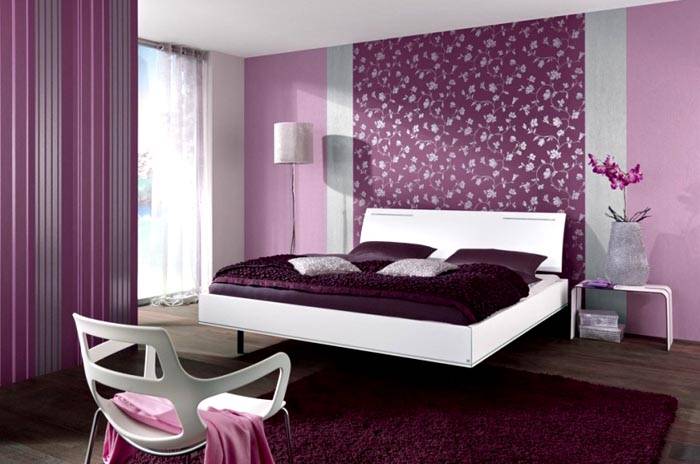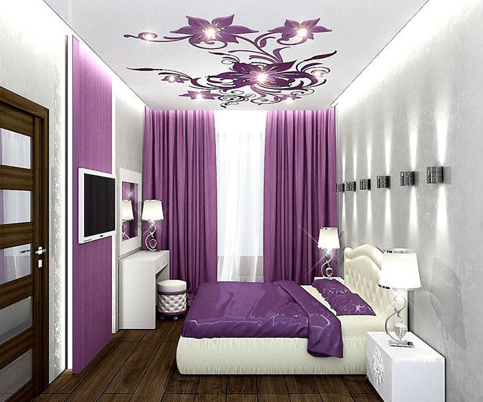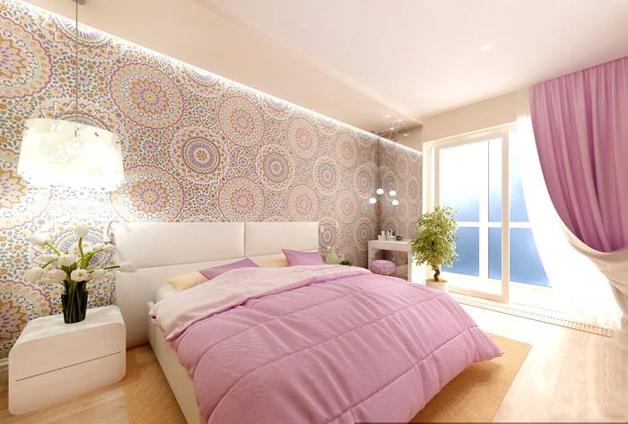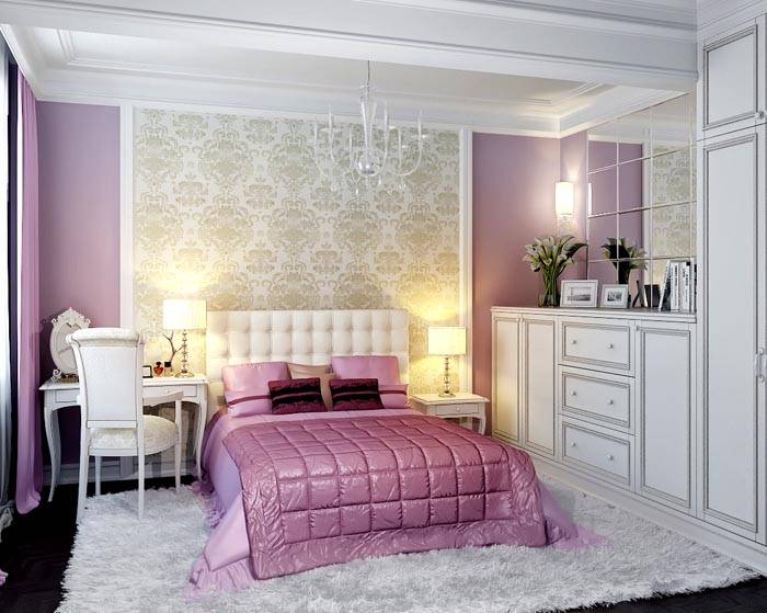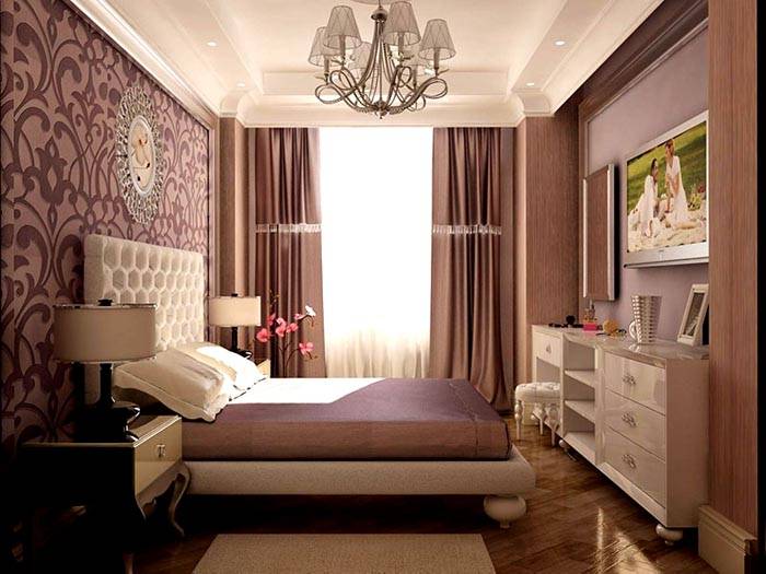 Δεδομένου ότι η κρεβατοκάμαρα είναι ένα μέρος για ύπνο και ξεκούραση, οι σχεδιαστές προτείνουν τη χρήση ελαφρών και σιωπηλών χρωμάτων για τη διακόσμηση του. Οι λιλά, ροδάκινο, μπλε ή ροζ αποχρώσεις φαίνονται καλές. Το γυαλιστερό χρώμα μπορεί να διευρύνει οπτικά το χώρο. Για διακόσμηση, μπορείτε να χρησιμοποιήσετε ταπετσαρία με ένα μικρό μοτίβο και απλά υφάσματα.