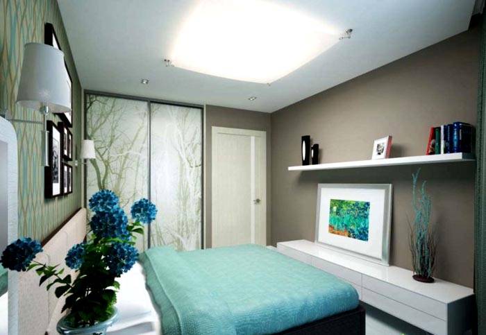 Θα βοηθήσουν στην πραγματοποίηση υψηλής ποιότητας ανακαίνισης του υπνοδωματίου 12 τετραγωνικών. Φωτογραφίες πραγματικών εσωτερικών σχεδίων. Είναι δύσκολο να εφοδιάσεις ένα τόσο μικρό δωμάτιο. Εάν είναι δυνατόν, είναι καλύτερο να αγοράσετε ένα πτυσσόμενο κρεβάτι. Τέτοια αντικείμενα θα βοηθήσουν στην εξοικονόμηση χώρου. Χρησιμοποιήστε ενσωματωμένες ντουλάπες αντί για ογκώδη κομμά. Μπορείτε να χρησιμοποιήσετε συμπαγή κομοδίνα σε συνδυασμό με ράφια ή ράφια.