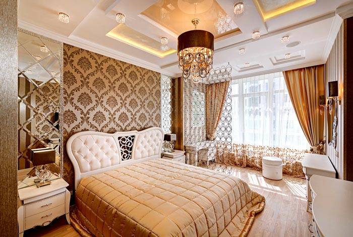 Θα πρέπει να υπάρχει άφθονο φως στην κρεβατοκάμαρα. Μπορείτε να προσθέσετε ενσωματωμένους λαμπτήρες, έναν πολυέλαιο και να βάλετε μια λάμπα στο κομοδίνο. Τα διακοσμητικά στοιχεία εξαρτώνται από το γενικό στυλ.