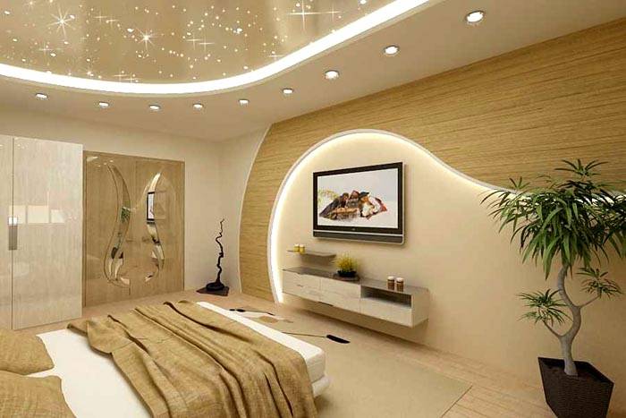 Η οροφή πρέπει να είναι σε αρμονία με το υπόλοιπο δωμάτιο. Ανάλογα με το στυλ του δωματίου, μπορείτε να δημιουργήσετε απλές, πολύπλοκες και πολυεπίπεδες δομές. Μπορείτε επίσης να δείτε στη φωτογραφία τα σχέδια των τεντωμένων οροφών στο υπνοδωμάτιο. Τα έπιπλα και οι λεπτομέρειες πρέπει να είναι στην ίδια παλέτα χρωμάτων.