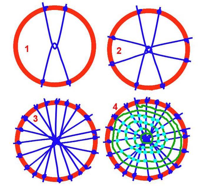 - Στο πρώτο στάδιο (1), δύο σχοινιά δένονται στο στεφάνι με οξεία γωνία. Ένα παρόμοιο στοιχείο δημιουργείται στην αντίθετη πλευρά με επικάλυψη βρόχου στο κέντρο κατά την εγκατάσταση.