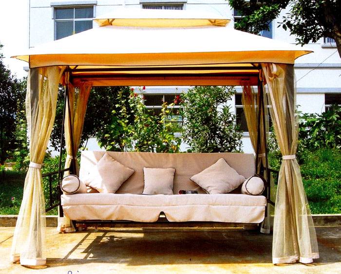 Αφού ολοκληρωθεί η συναρμολόγηση, τραβιέται η τέντα, τοποθετούνται τα μαξιλάρια που προετοιμάζονται εκ των προτέρων για την κούνια κήπου. Ο σχεδιασμός που περιγράφεται εδώ θα αποδειχθεί αρκετά βαρύς, οπότε είναι καλύτερο να εκτελέσετε όλες τις ενέργειες απευθείας στο χώρο εγκατάστασης του προϊόντος. Οι περιγραφόμενες αναρτήσεις είναι αρκετά λειτουργικές. Αλλά μπορούν να βελτιωθούν εάν τα άνω συγκροτήματα είναι τοποθετημένα σε ρουλεμάν.