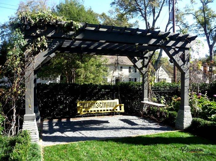 Εδώ χρησιμοποιούνται συγκολλημένοι σύνδεσμοι και σφυρήλατα στοιχεία. Το άκαμπτο πλαίσιο είναι κατασκευασμένο από μέταλλο. Ωραίο "ζεστό" κάθισμα - κατασκευασμένο από ξύλο. Ένα μεγάλο διαφανές φύλλο πολυανθρακικού προστατεύει καλά από τη βροχή και τον ήλιο. Ζυγίζει λίγο, οπότε δεν δημιουργεί περιττά φορτία στα στοιχεία ισχύος.