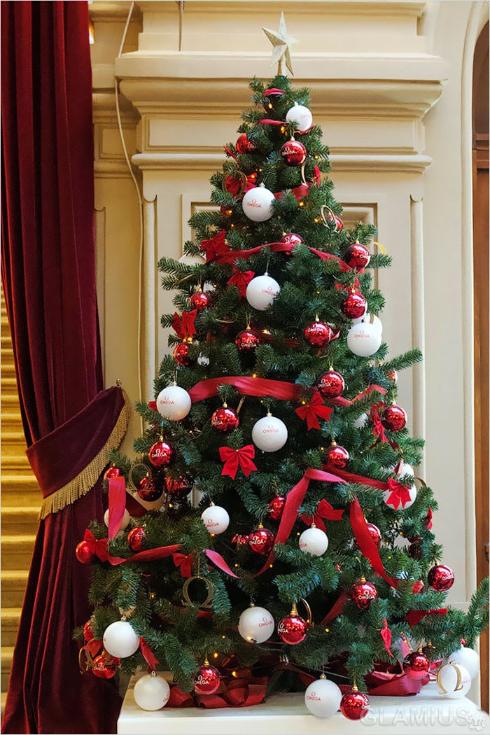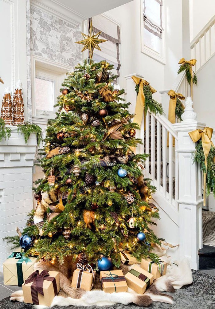 Το χριστουγεννιάτικο δέντρο έχει μια πολυτελή μοντέρνα εμφάνιση ως αποτέλεσμα τόσο χαοτικής όσο και σπειροειδούς τοποθέτησης διακοσμήσεων.