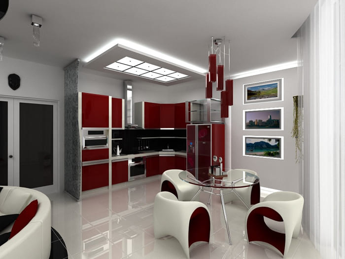 Δεν θα είναι περιττό να ρίξουμε μια ματιά σε ποιες λύσεις έχουν βρει οι σχεδιαστές για μια συνδυασμένη κουζίνα και σαλόνι σε στυλ υψηλής τεχνολογίας. Το αποτέλεσμα είναι κομψές και άνετες κουζίνας-τραπεζαρίας υψηλής τεχνολογίας.