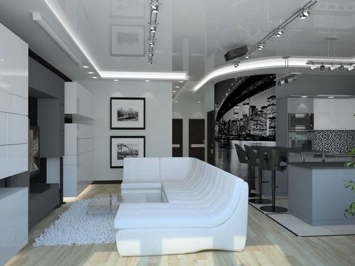 Για να θαυμάσετε μια τέλεια επίπεδη οροφή, μπορείτε να εγκαταστήσετε μια τεντωμένη οροφή με ματ ή γυαλιστερό φινίρισμα. Το Gloss είναι ευπρόσδεκτο, αλλά σε αυτήν την περίπτωση, λαμβάνονται υπόψη και άλλες επιφάνειες, έπιπλα και αξεσουάρ. Η αφθονία της στιλπνότητας σίγουρα δεν θα διακοσμήσει το δωμάτιο.
