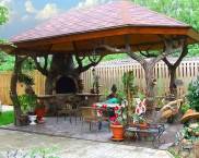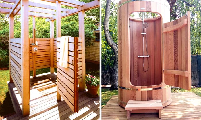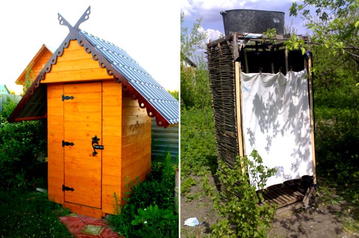 Σε μια εξοχική κατοικία, διακοσμημένη με σχεδιασμός τοπίου, θα φαίνεται πρωτότυπο καμπίνα ντους, κατασκευασμένο με τη μορφή ξύλινου σπιτιού. Αυτό το ντους έχει οροφή και είναι συχνά εξοπλισμένο με ζεστό νερό.