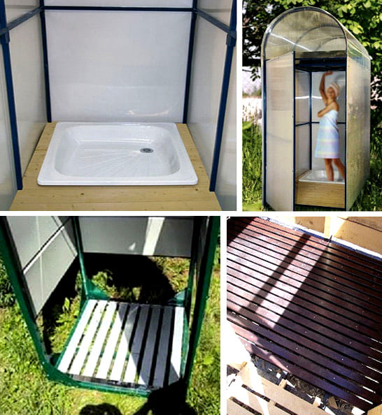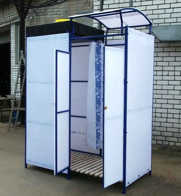 Αυτή η επιλογή βασίζεται σε ένα μεταλλικό πλαίσιο, πάνω από το οποίο είναι στερεωμένο ένα περίβλημα πολυανθρακικό... Στην οροφή τοποθετείται μια επίπεδη δεξαμενή με ένα ήδη οργανωμένο ποτιστήρι. Το δάπεδο σε ένα τέτοιο ντους είναι κατασκευασμένο από ξύλο. Συνιστάται να τοποθετήσετε τη δομή σε σκυρόδεμα ή σε ειδικό χώρο όπου αφαιρείται το νερό δίκτυο αποχέτευσης.