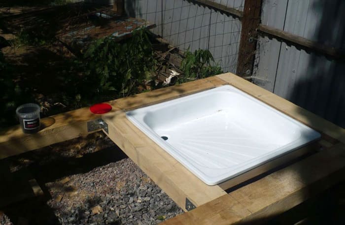 Απομένει μόνο να εγκαταστήσετε ένα ντους εξωτερικού χώρου από ξύλο σε ένα ήδη προετοιμασμένο ίδρυμα και να το επενδύσετε με σκιασμένο υλικό.