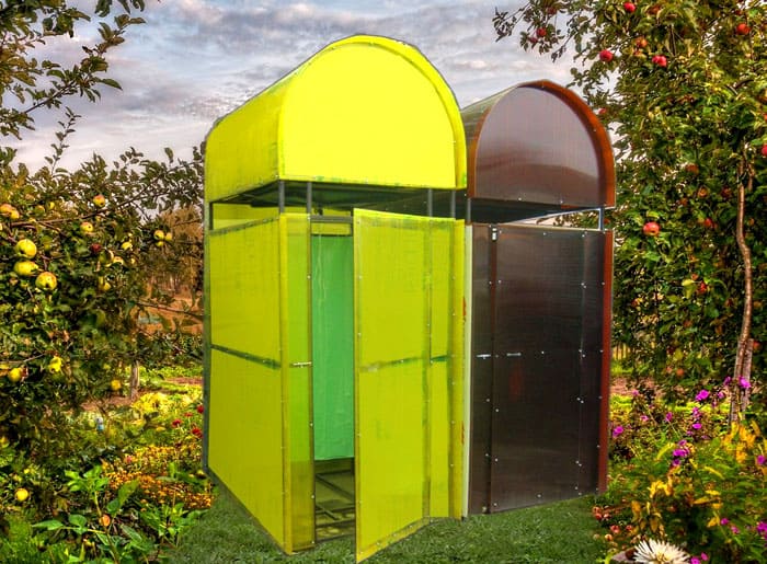 - Υπαίθριο ντους από πολυανθρακικό. Αυτό το υλικό απαιτεί υποχρεωτική στεγανοποίηση των τμημάτων, καθώς το νερό εισέρχεται σε αυτά και με την πάροδο του χρόνου αρχίζει να φθείρεται. Οι ίδιοι οι καμβάδες είναι ημιδιαφανείς, οπότε είναι καλύτερο να επιλέγετε επιλογές με καλή σκίαση.