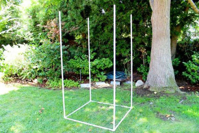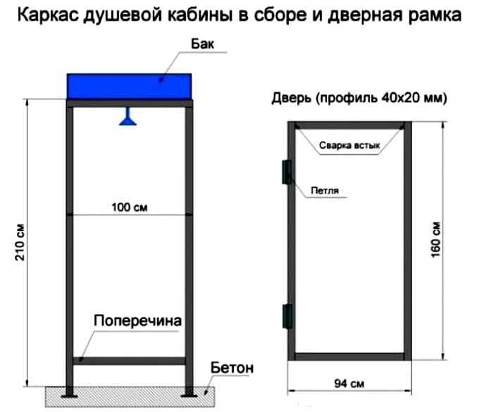 Το κύριο μέρος του καλοκαιριού ντους είναι φτιαγμένο με λευκούς τοίχους, η κορυφή μπορεί να γίνει με τη μορφή πλέγματος. Ένα μεταλλικό προφίλ τοποθετείται στην κορυφή της κατασκευής (μπορούν να χρησιμοποιηθούν παλιοί σωλήνες). Θα χρησιμεύσει ως τόπος εγκατάστασης της δεξαμενής.