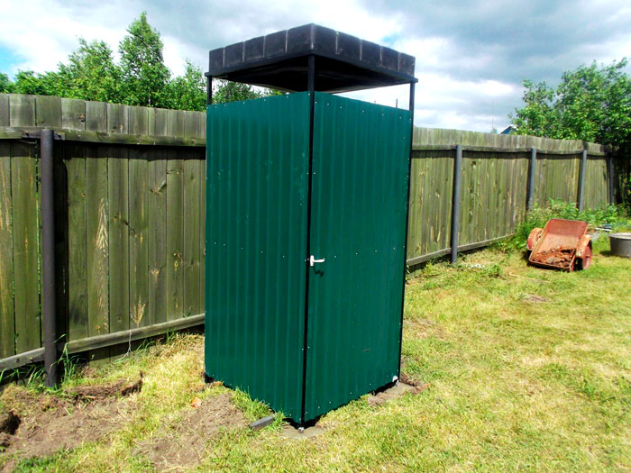 Όσον αφορά την επιλογή προϋπολογισμού (προσωρινή), μπορεί να είναι κατασκευασμένη από ξύλινο σκελετό. Μικρά κλαδιά από δέντρα ή καλάμια θα παίξουν το ρόλο της οθόνης. Το δάσος με το πινέλο. Αντί για πόρτα, είναι σκόπιμο να κρεμάσετε το πετρέλαιο σε δαχτυλίδια. Στο κάτω μέρος τοποθετούνται στρώματα ραφιών με τρύπες για αποστράγγιση νερού. Η δεξαμενή νερού είναι εγκατεστημένη στην οροφή με μια προκατασκευασμένη βάση για αυτό. Το νερό θερμαίνεται από ηλιακή θερμότητα.