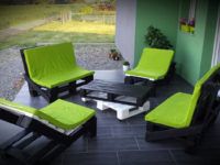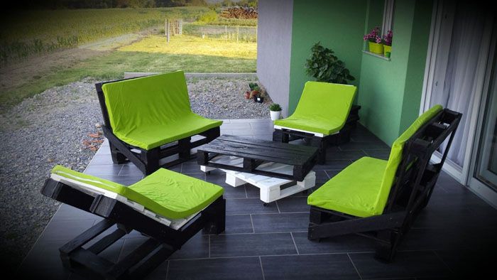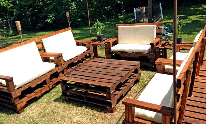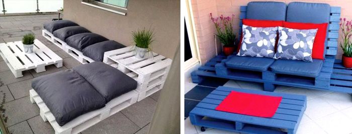 Μπορούν να προστεθούν έπιπλα παλετών εξοχικών σπιτιών τραπέζια και καρέκλες για κιόσκια, παγκάκια για τον κήπο. Όλα αυτά γίνονται πολύ απλά και δεν απαιτούν τη χρήση ειδικών εργαλείων.Η παρακάτω φωτογραφία δείχνει παραδείγματα επίπλων κήπου παλετών.