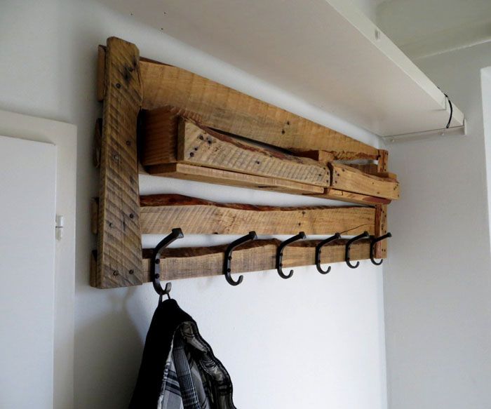 Κρεμάστρα μέσα διάδρομος θα διακοσμήσει μια εξοχική κατοικία ή διαμέρισμα. Μόνο μία παλέτα είναι αρκετή, πρέπει να υποβληθεί σε προσεκτική επεξεργασία και να καλυφθεί με ξύλο και βερνίκι.