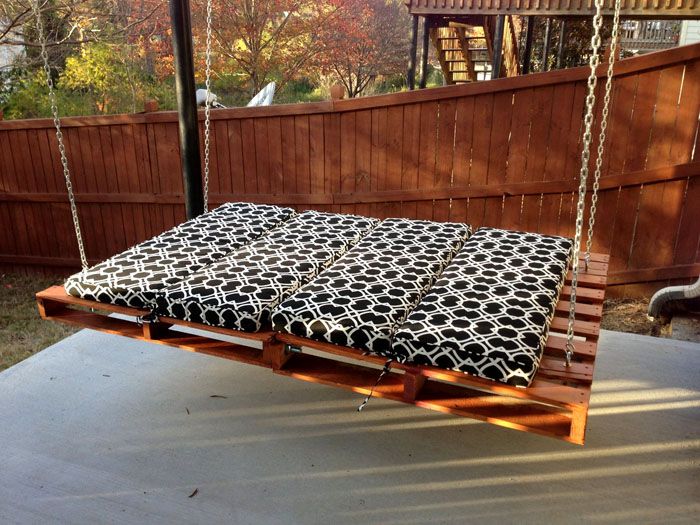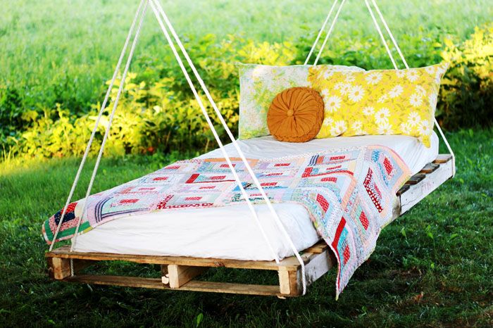 Είναι καλύτερα να χρησιμοποιήσετε αλυσίδες ή ισχυρά σχοινιά για να στερεώσετε το κρεμαστό κρεβάτι. Σε μια καυτή καλοκαιρινή μέρα, θα χρειαστείτε μια ξαπλώστρα για ηλιοθεραπεία. Για αυτόν, πρέπει να προετοιμάσετε 3 παλέτες: δύο από αυτές για την ξαπλώστρα, η τρίτη για την πλάτη. Απομένει μόνο η συναρμολόγηση της απλούστερης δομής, η βαφή και η κάλυψή της με άνετα μαξιλάρια.