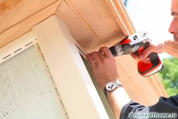 Αφού διορθώσουμε τα αρχικά προφίλ, προχωράμε στην εγκατάσταση εξωτερικών γωνιακών προφίλ. Αρχικά, επισημαίνουμε τα soffits για τον προσδιορισμό των άκρων των στοιχείων και, στη συνέχεια, εγκαθιστούμε το γωνιακό προφίλ με κενό 3 mm στο soffit ή στην οροφή. Το στερεώνουμε με τον ίδιο τρόπο όπως και για τη γραμμή εκκίνησης. Φροντίστε να κεντράρετε το προφίλ πριν σφίξετε. Τα εσωτερικά γωνιακά προφίλ είναι τοποθετημένα με τον ίδιο τρόπο όπως τα εξωτερικά.