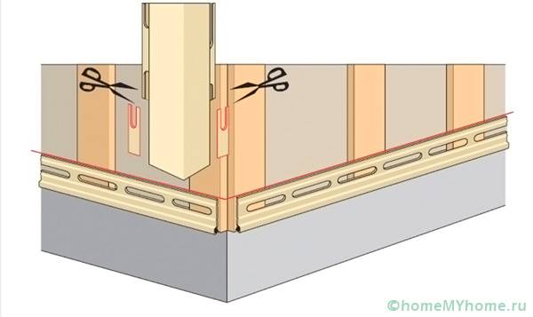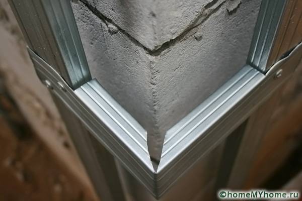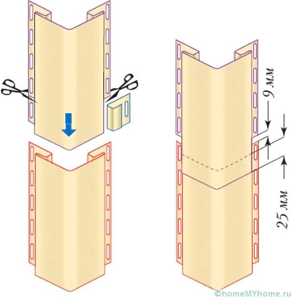Σε ορισμένες περιπτώσεις, όταν το ύψος των κτιρίων είναι από έναν όροφο κατά μήκος, οι γωνίες μπορεί να είναι μεγαλύτερες από 3 μέτρα και καθίσταται απαραίτητη η πραγματοποίηση επέκτασης προφίλ. Σε τέτοιες περιπτώσεις, είναι απαραίτητο να περικόψετε κάθε επόμενο προφίλ έτσι ώστε να μπορεί να εισαχθεί στο προηγούμενο. Για να το κάνετε αυτό, χρησιμοποιήστε μεταλλικό ψαλίδι για να κόψετε τα πλαϊνά μέρη για την τοποθέτηση του πλαισίου, αφήνοντας μόνο το μπροστινό γωνιακό μέρος. Το μήκος κοπής πρέπει να είναι τουλάχιστον 25 mm. Επιπλέον, θα πρέπει να αφήσετε ένα κενό περίπου 9 mm μεταξύ των δύο στοιχείων.