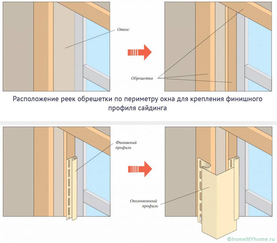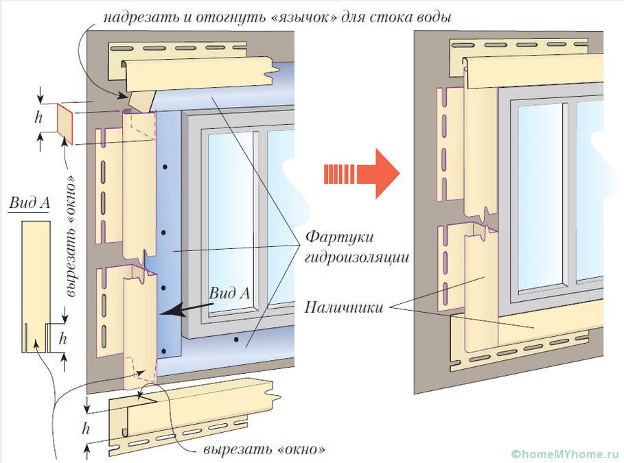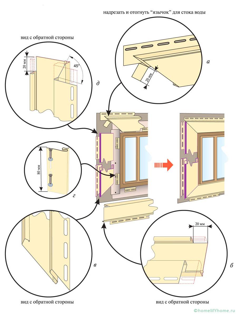 Τα παράθυρα είναι επενδεδυμένα με πλαϊνά μόνο μετά την εγκατάσταση της χαμηλής παλίρροιας. Γι 'αυτό, το άνοιγμα μετράται και τα στοιχεία κόβονται σε μέγεθος με μια κάμψη στο σημείο προσάρτησης σε ορθή γωνία και από την πλευρά του αποχετευτικού συστήματος. Μετά από αυτό, το άκρο προσαρτάται στο πλαίσιο χρησιμοποιώντας μια κόλλα ή υγρά καρφιά προκειμένου να επιτευχθεί υψηλή στεγανότητα και πυκνότητα επαφής.