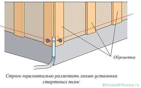 Ξεκινάμε την εγκατάσταση από το κάτω μέρος της δομής. Παίρνουμε το αρχικό προφίλ και το στερεώνουμε σε ύψος κλουβιού 5 cm, έχοντας προηγουμένως βιδώσει δύο βίδες αυτοεπιτροπής σε αυτό το ύψος και στις δύο πλευρές του τοίχου ως οδηγό. Ταυτόχρονα, παρέχουμε αρκετό χώρο για την εγκατάσταση προφίλ γωνιών. Μπορείτε να κόψετε το επιπλέον μέρος αμέσως μετά τη στερέωση ή πριν από την εγκατάσταση. Οι βίδες ή τα καρφιά με δυνατότητα αυτόματης τοποθέτησης θα πρέπει να τοποθετούνται περίπου στη μέση της ειδικής τρύπας για τη στερέωση του προφίλ.
