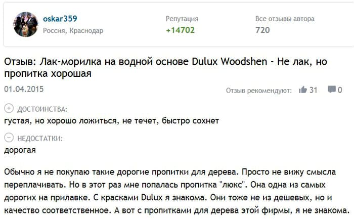 Πλεονεκτήματα: στεγνώνει σε 2-3 ώρες, δεν έχει οσμή, δεν εκπέμπει διαβρωτικά ή τοξικά καπνά κατά την εφαρμογή και κατά τη διάρκεια της περαιτέρω λειτουργίας, σχηματίζει ομοιόμορφη επίστρωση χωρίς λεκέδες, παρέχει αξιόπιστη προστασία του ξύλου.