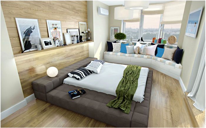Υπάρχει τοίχος με έμφαση στο κεφάλι του κρεβατιού. Εδώ μπορείτε να τοποθετήσετε μια φωτεινή εικόνα ή μια σύνθεση φυσικών υλικών, όπως το ξύλο.