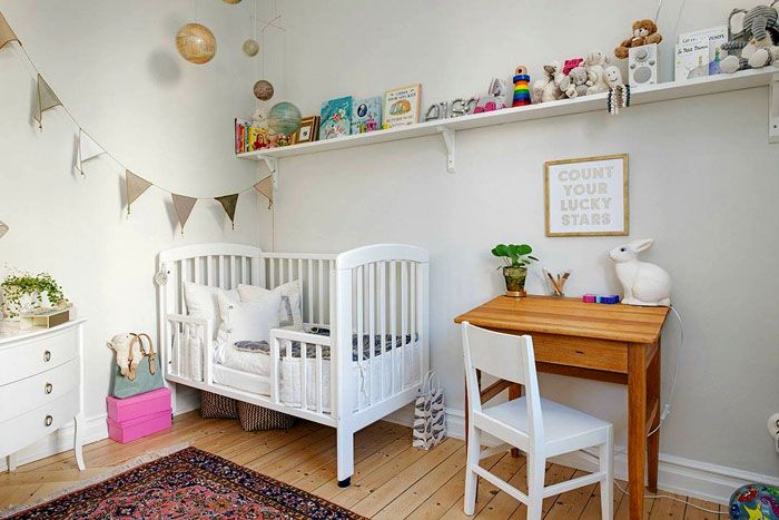 Όσο για το σχέδιο στο σκανδιναβικό στιλ, πρέπει να σημειωθεί ότι ένας τέτοιος σχεδιασμός μπορεί να μετατραπεί καθώς το παιδί μεγαλώνει και ταυτόχρονα αντιστοιχεί πλήρως στα φυσιολογικά και διανοητικά χαρακτηριστικά του που σχετίζονται με την ηλικία. Οι λευκοί τοίχοι μπορούν να ξαναβαφτούν εύκολα εάν το παιδί λερωθεί και τα έπιπλα από φυσικό ξύλο είναι ασφαλή και άνετα για τα παιδιά. Τα υφάσματα και τα παιχνίδια χρησιμοποιούνται ως φωτεινές πινελιές.