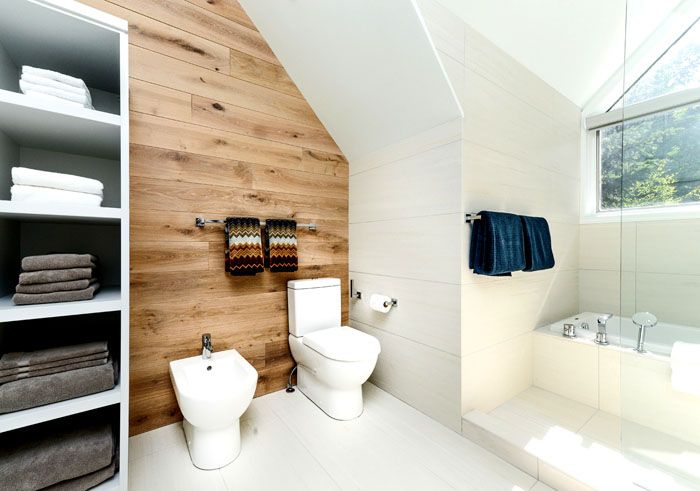 Παρεμπιπτόντως, στα έπιπλα, μπορείτε να "εξαπατήσετε" λίγο υπέρ της πρακτικότητας. Τα σύγχρονα υλικά με επίστρωση επαναλαμβάνουν επίσης τη δομή του ξύλου, αλλά ταυτόχρονα διακρίνονται από την αυξημένη αντοχή στην υγρασία. Μια ενδιαφέρουσα ιδέα είναι να χρησιμοποιήσετε μια ξύλινη γραμματοσειρά αντί για μπάνιο.
